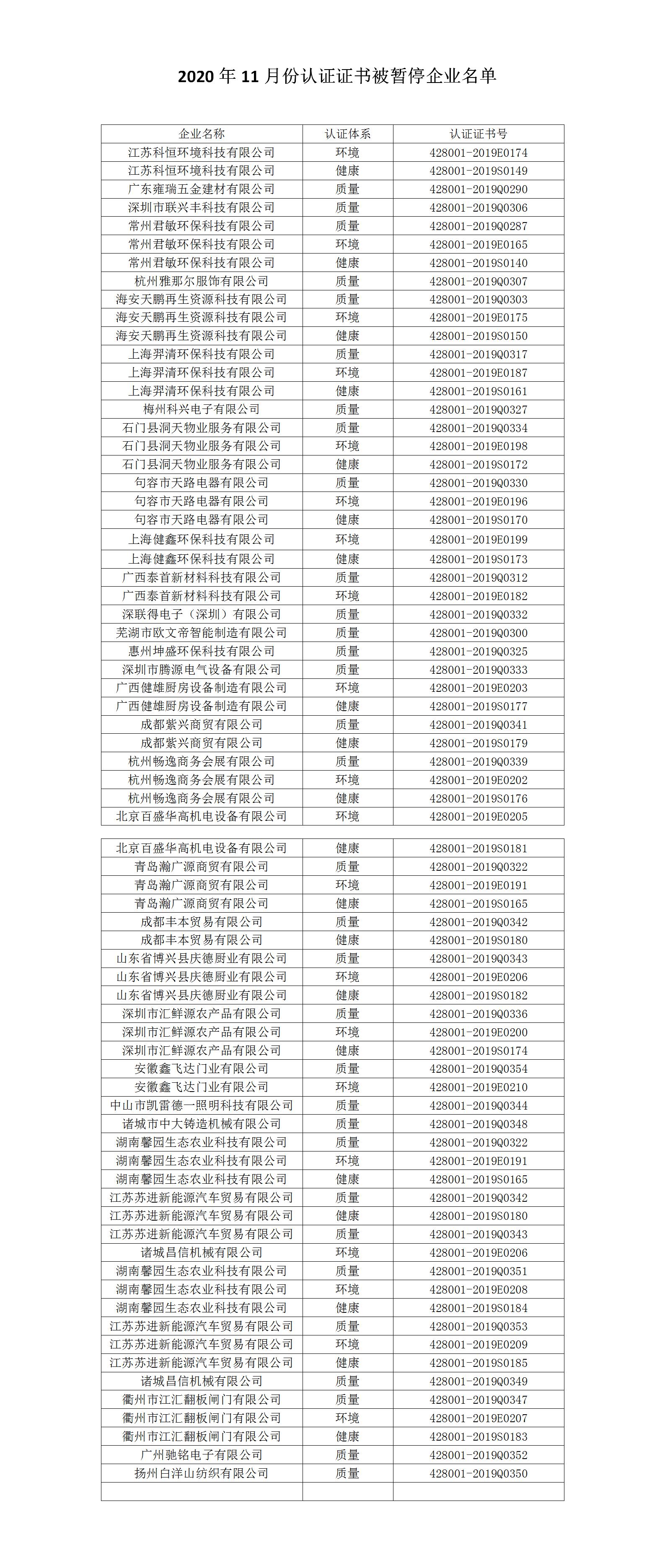 2020年11月認(rèn)證證書被暫停企業(yè)名單...