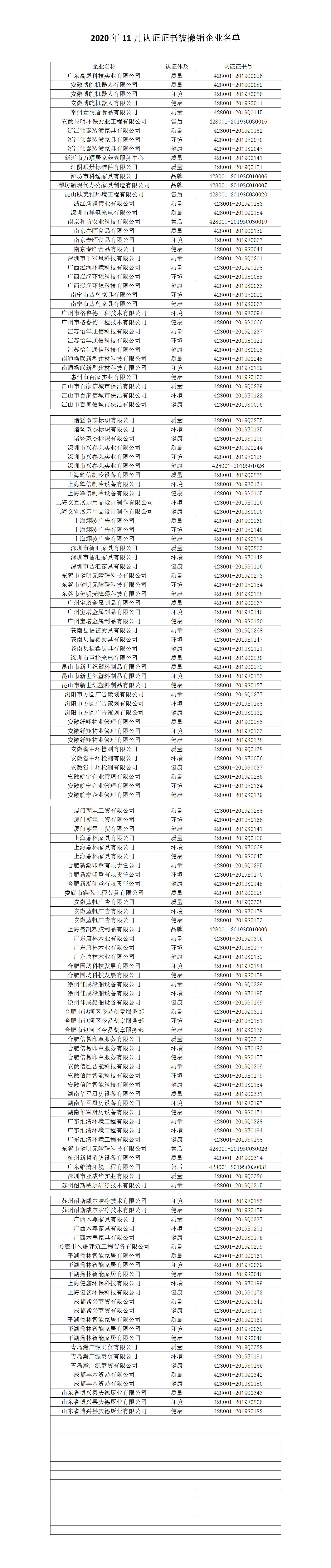 2020年11月認(rèn)證證書被撤銷的企業(yè)名單...
